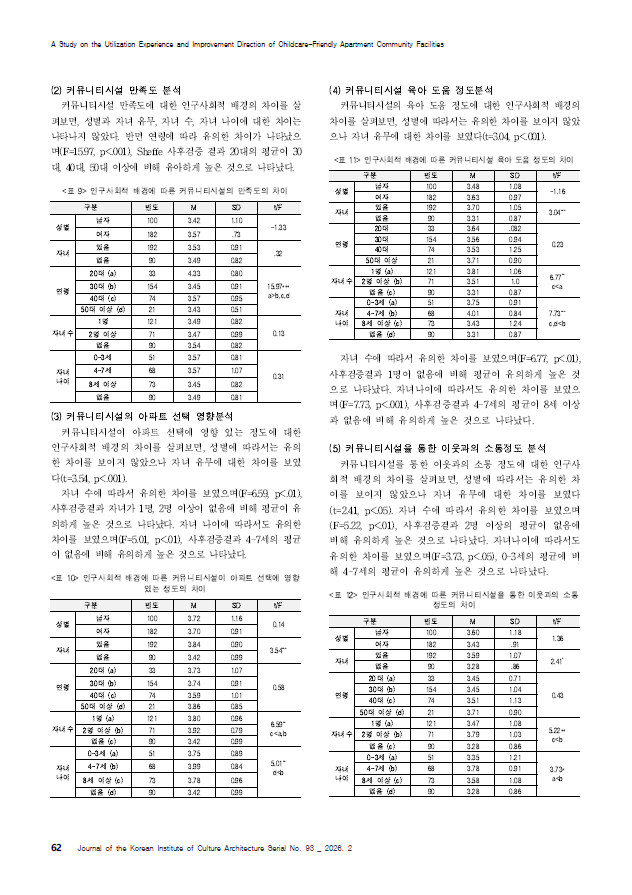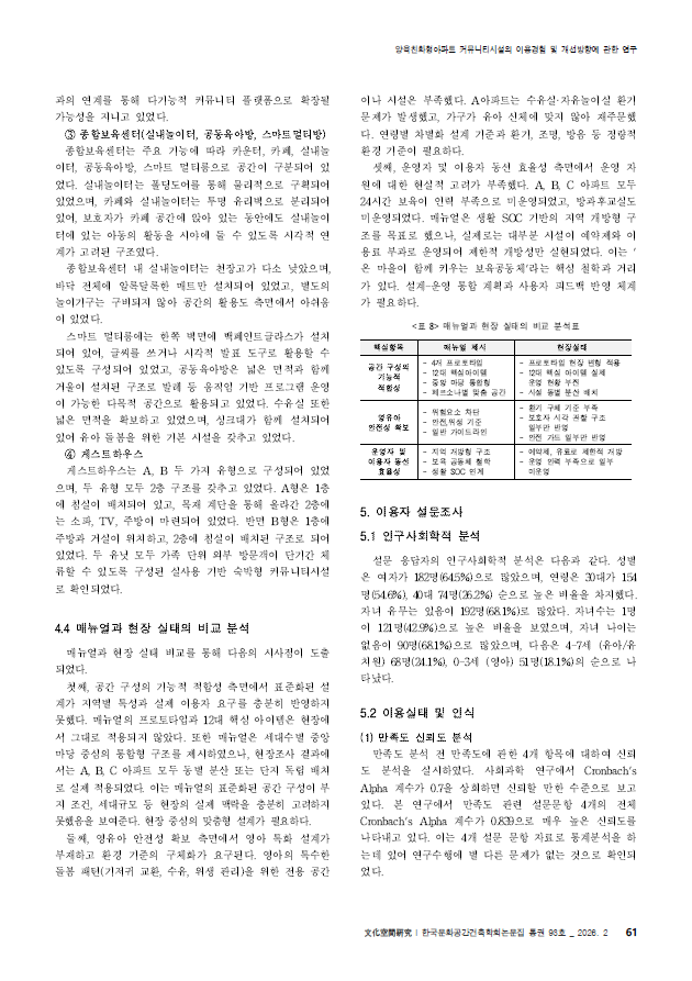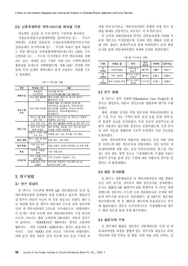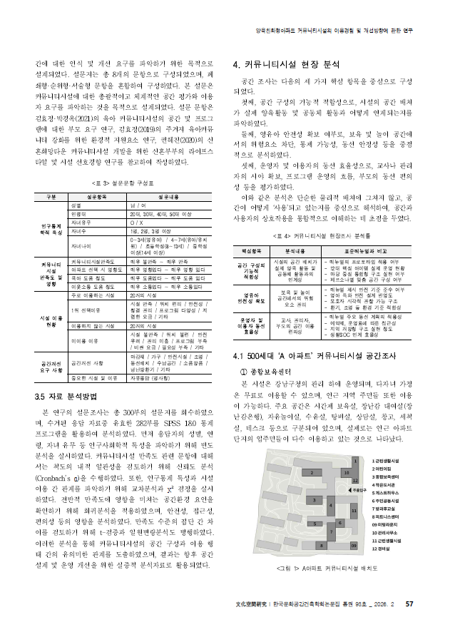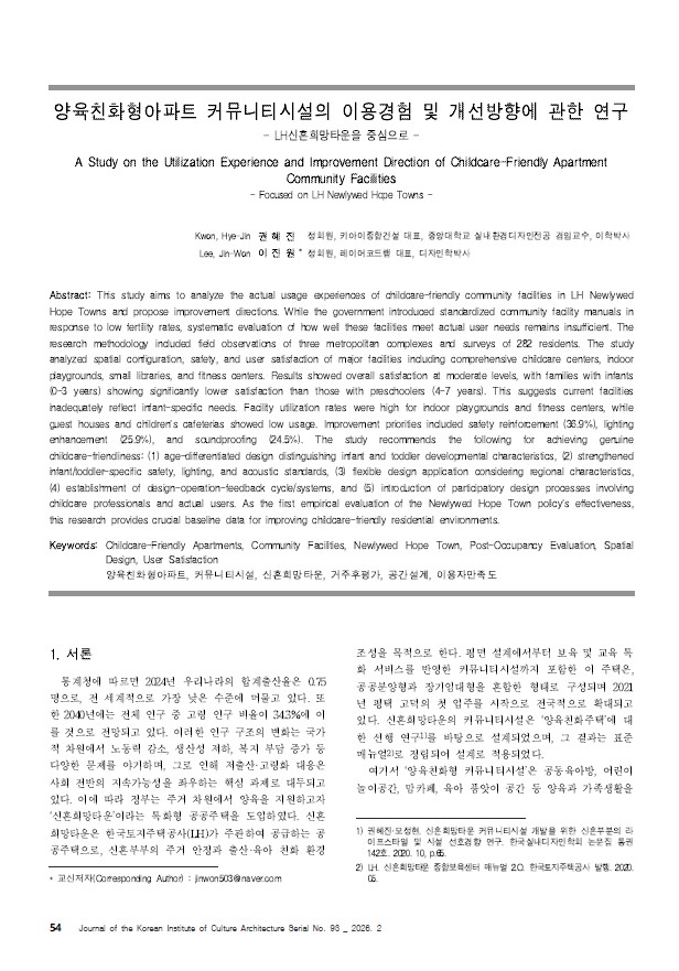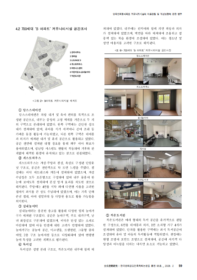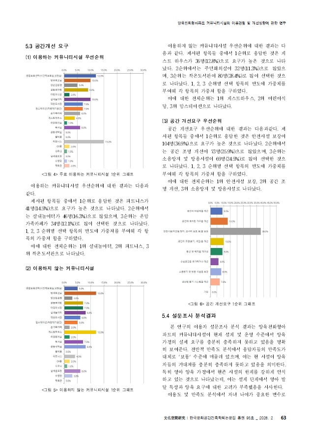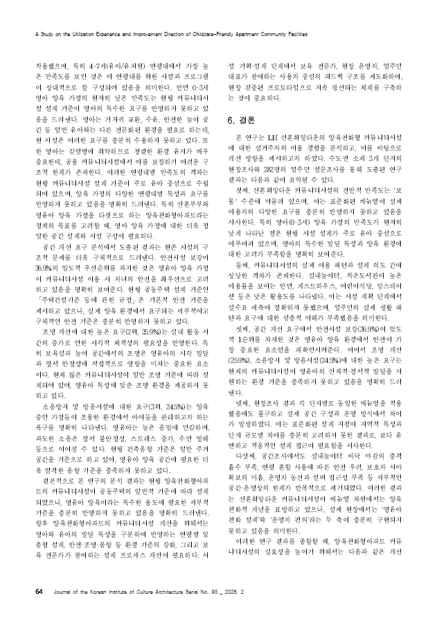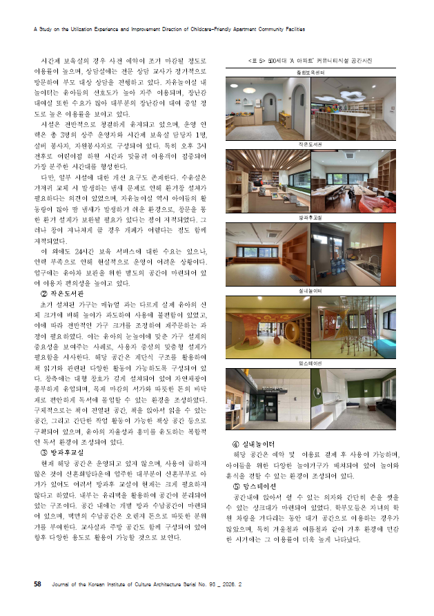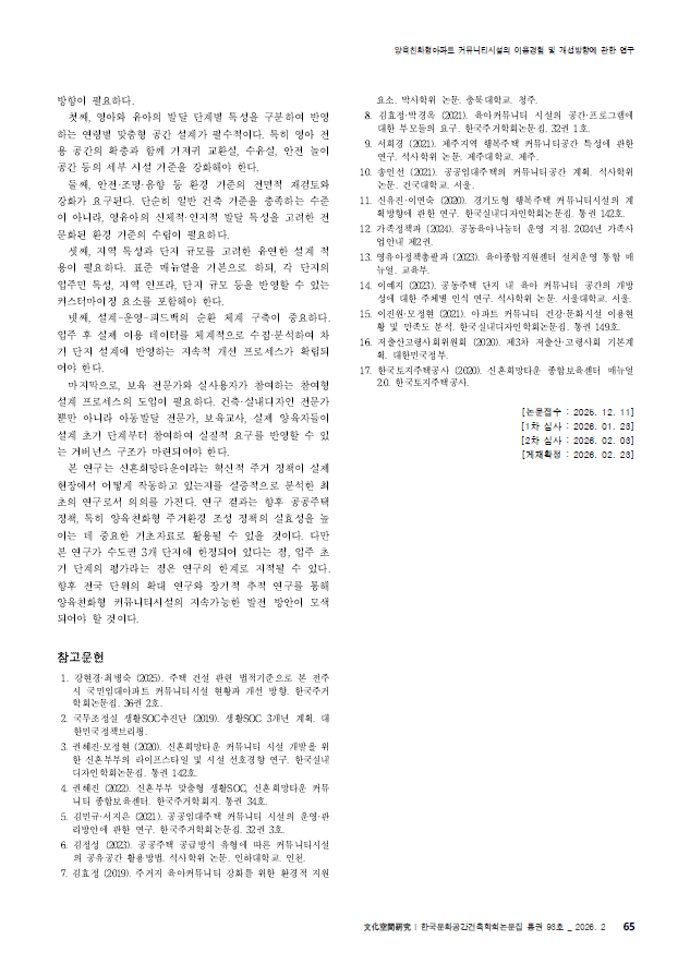 [문화공간건축학회 논문발간] 양육친화형아파트 커뮤니티시설의 이용경험 및 개선방향에 관한 연구