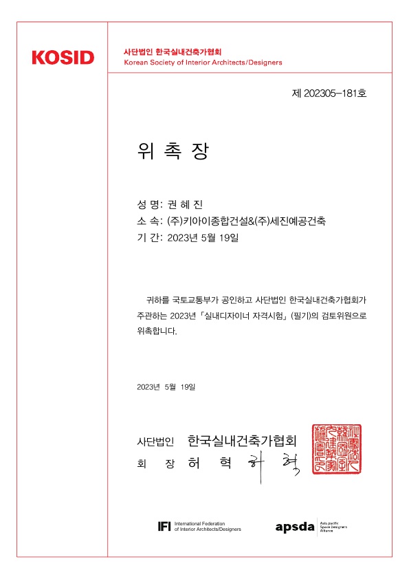 2023 <실내디자이너 자격 시험> KOSID 검토위원 위촉장