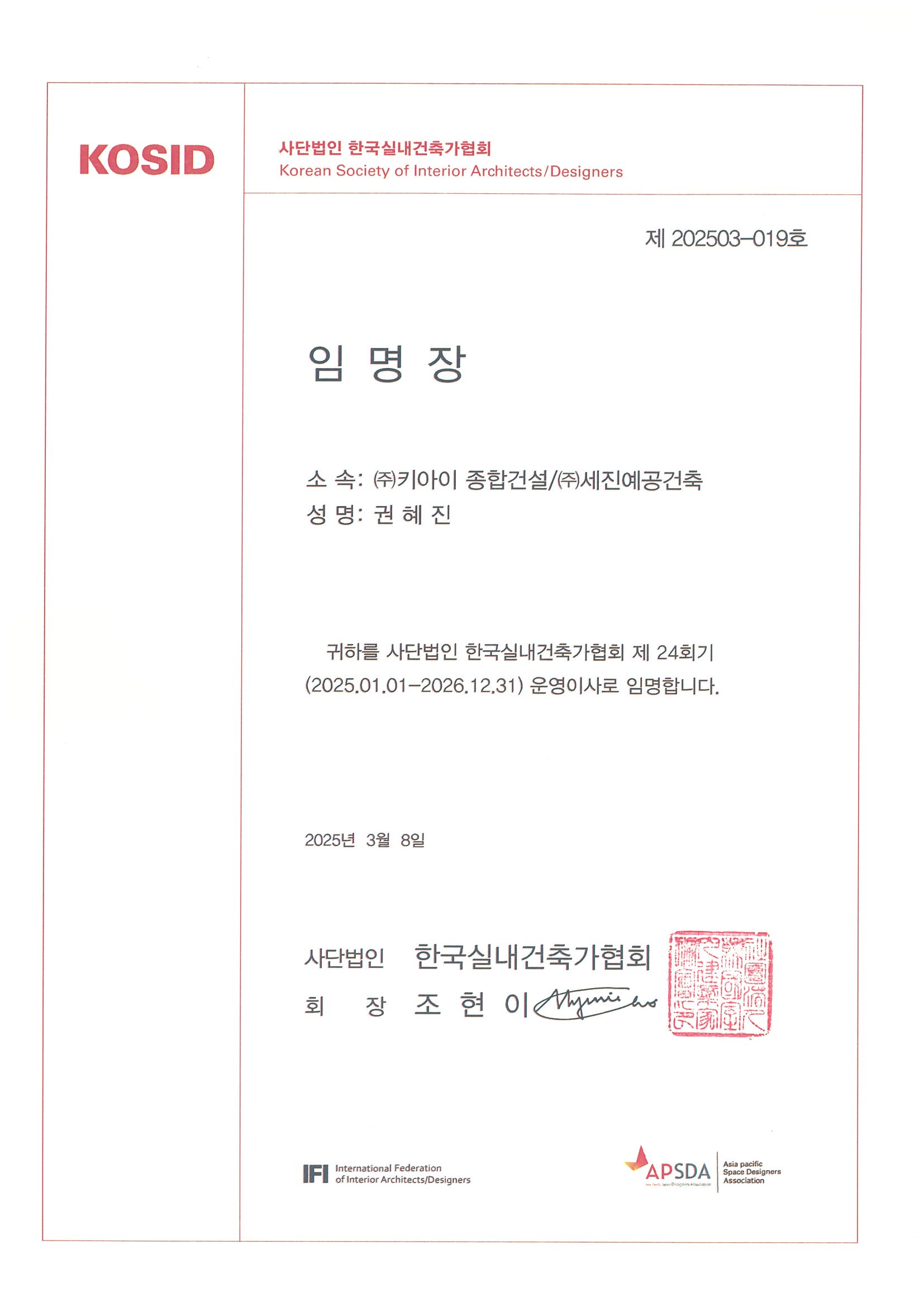 2025 KOSID 한국실내건축가협회 운영이사 임명장
